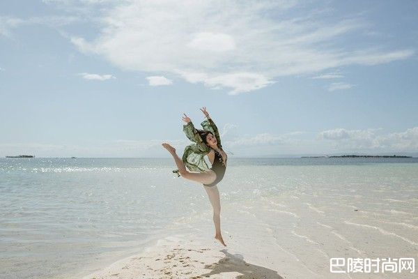 Albee穿着黑色泳装,胸前是大深V的设计,开口几乎逼近腹部的一半位置,从侧面角度看过去,正好露出东西半球,但除了身材之外,最令人惊叹的是动作,她在海滩上一跃,双手高举着,右脚向后方高高抬起,两腿拉开距离几乎是180度,就像在碧海蓝天飞舞的精灵一样美丽。