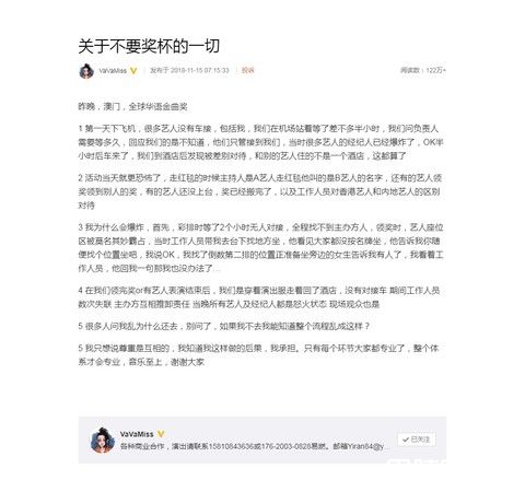 而对此争议,VAVA15日一早也亲自回应了,并列举出《关于不要奖杯的一切》,包括机场无人接机、饭店差别待遇,还有红毯上叫错艺人名字、颁错奖杯,以及自己彩排时无人接应,不但空等了2小时,全程还找不到主办方,另外,典礼上艺人座位区被霸占、主办方互相推卸责任等,种种疏失让她忍无可忍。对于遭质疑对颁奖典礼不尊重,她也无奈回应:我只想说尊重是互相的。并表示愿意承担一切后果,最后也表明自己的立场音乐至上!