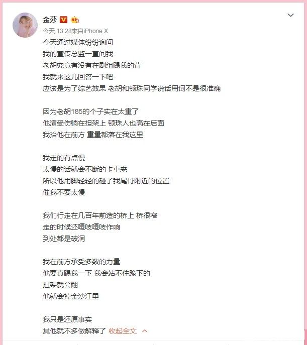 虽然胡歌公开说明踢背举动,也引来现场观众笑声,时隔将近4年,拍摄趣谈被视为负面黑料。对此金莎发文:因为老胡185的个子实在太重了,他演受伤躺在担架上顿珠人也高在后面,我抬他在前方重量都落在我这里,我走的有点慢,太慢的话就会不断的卡重来,所以他用脚轻轻的碰了我尾骨附近的位置,催我不要太慢……,最后强调我在前方承受多数的力量,他要真踢我一下我会站不住跪下的,担架就会翻,他就会掉金沙江里,我只是还原事实,其他就不多做解释了。
