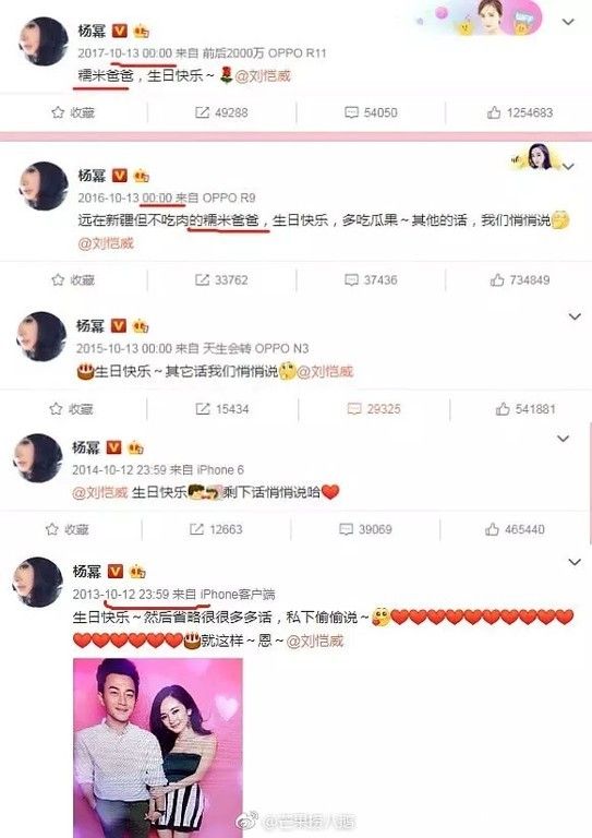杨幂自2013年起,每逢刘恺威10月13日生日当天,必定会在0:00准时发文送上祝福,连续5年来都没有缺席过,最初写着省略很多话,私下偷偷说、其他话我悄悄说,用词相当甜蜜,到了2016年以后,却都是以糯米爸爸称呼对方,到了2018年在刘恺威生日当天,她已是没有任何表示,也未有多说什么。当时外界就猜测两人感情生变,如今再次看来,两人离婚似乎是早有玄机。