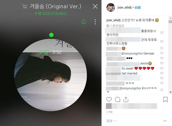 韩女团少女时代出身的秀英,离开老东家后首度以个人歌手方式回归乐坛,发行单曲《Winter Breath》,交往6年男友郑敬淏也力挺,在IG发文显示正在听女友新歌之外,还假装发现新大陆一般写下是新人吗?歌好好听,和演员好友一搭一唱演不熟,笑翻粉丝。