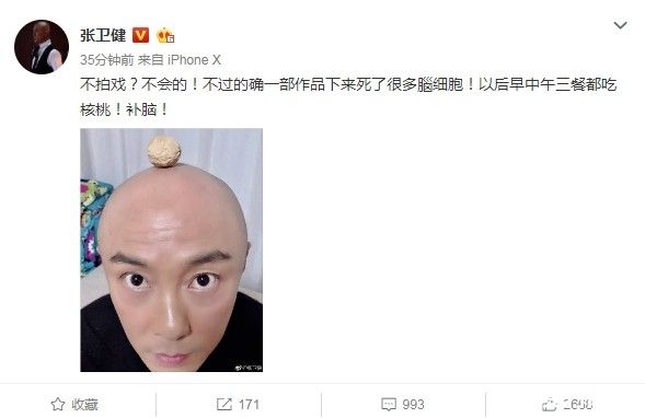 张卫健不再接戏的传言惊动两岸三地,对此他27日晚间在微博发文:不拍戏?不会的!不过的确一部作品下来死了很多脑细胞!以后早中午三餐都吃核桃!补脑!