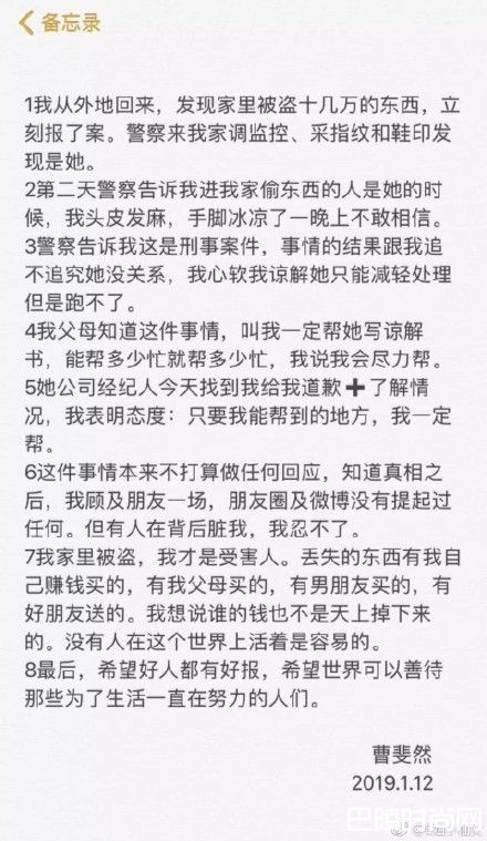 曹斐然在微信朋友圈中发声明透露,原本自己不想公开此事,但发现有人在背后抹黑自己,才决定将事情真相说出来,他在声明中指出,某次从外地回来,发现家中遭窃,随即报警,后来经过警方搜证,采取指纹等,才发现嫌犯就是她的朋友,虽然难以置信,但她还是想原谅对方,不过盗窃是刑事案件:事情的结果跟我追不追究她没关系,我心软、我谅解她只能减轻处理,但是跑不了。
