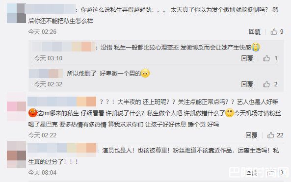 许凯19日凌晨接近2点时发文:我不知道是哪几位粉丝,但是不要再敲我门,或者点外卖来了...,相互尊重一下,可以吗?由此可见私生饭无所不用其极,想介入偶像的生活中,却严重影响偶像的作息,他无力反击只能发文劝告,网友叹偶像因为不堪其扰发微博,有时反倒让私生觉得自己行为有成果而得到快感,果然他发文不久后就删除,网友感叹:好卑微的一个男的。