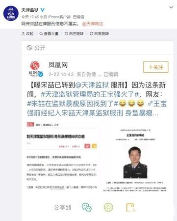 今日(22日),网上疯传宋喆入天津监狱服刑,整个人憔悴爆瘦,且天津市监狱管理局办公室副主任刚好也叫王宝强。稍晚,天津监狱官方微博发文称消息不属实。