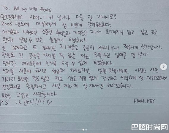 Key是继队长温流之后第二位入伍的SHINee成员,和温流同样选择低调入伍的他,也在昨日透过个人IG公开手写信。信里提到2008年出道以后,和歌迷们一起创造的珍贵回忆,都成为了他们朝着共同目标前进的动力,虽然出道至今从未经历这么长的空白期,歌迷们也可能会感到遗憾或依依不舍,但自己会无后顾之忧,健康并坚强的快去快回。