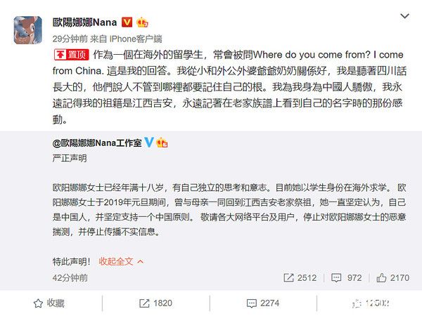 欧阳娜娜21日下午在微博发声表明我是中国人,我为我身为中国人骄傲,我永远记得我的祖籍是江西吉安,永远记着在老家族谱上看到自己的名字时的那份感动。对此欧阳龙回应,在电话难掩激动:见鬼了!说女儿是台独,乱扣帽子,七月半还没到。