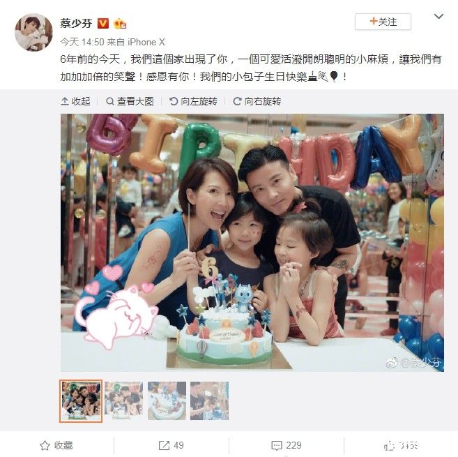 除了分享庆生全家福外,蔡少芬不忘感性PO文6年前的今天,我这个家出现了你,一个可爱活泼开朗聪明的小麻烦,让我有加加加倍的笑声!感恩有你!我的小包子生日快乐!为女儿送上祝福。