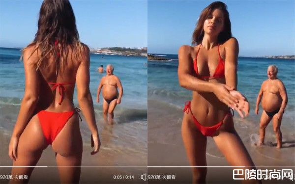 从影片中可以看到,当时女模站在海滩上不停地摆出性感姿势,先是对镜头露出迷人电眼,还拉起泳裤的绳子,吸引大家目光,然而,正当她转身过去对镜头回眸一笑时,画面右边突然出现一位白发大叔,挺着啤酒肚慢慢地路过女模后方,而且在全程都露出如痴汉般的神秘笑容,瞬间抢走女模的魅力。更好笑的是,当镜头刻意向左偏卡掉大叔后,他仍悠哉地再次出现在镜头内。