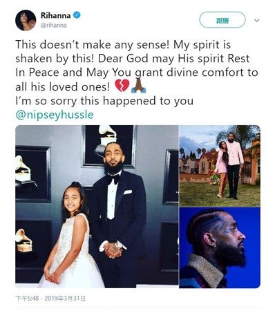 美国饶舌歌手尼普塞(Nipsey Hussle)在他的店门外卷入激烈枪击事件,身中多枪,紧急送医后宣告不治,得年仅33岁。他乐善好施,死讯传来后不少演艺圈好友全发文哀悼,蕾哈娜更难过表示,我的灵魂都在发抖,悲恸不已。
