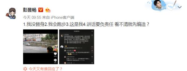 彭昱畅得知后也气得在8日上午列出4点反驳,我没替身、我会跑步、这是我、讲话要负责任,看不清就先编造,他身为一个演员会对自己负责,同时也会对给与支持、喜爱的粉丝负责,面对这样的造谣实在很无奈,再次强调说话真的要负责。