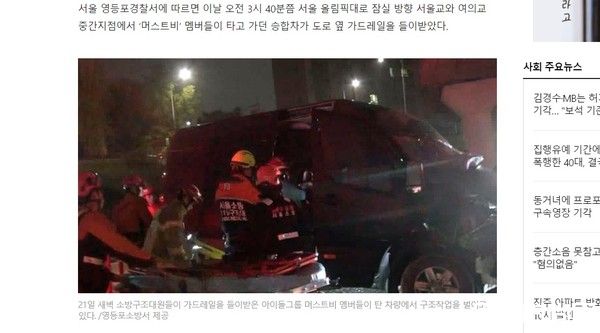 据韩媒体报导,MustB在21日凌晨3点多搭乘保母车从大邱返回首尔,途中突然撞上路边护栏,车头被撞扁,可见当时撞击力道之大,负责开车的孙姓经纪人首当其冲,被拖出时已是重伤,紧急送往梨花女大木洞医院治疗,最后仍是伤重不治。