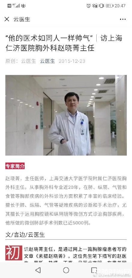 据小编查资料了解到,这位赵晓菁医生医术高明,网络上很多人表示对他的感谢,资料显示,赵晓菁医生于1996年毕业于复旦大学医学院(原上海医科大学); 1996年7月进入上海市胸科医院工作; 曾到日本和美国进修,专业上很是牛逼,治愈了很多人,帮助了很多家庭,称得上再世华佗。