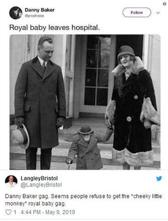 丹尼贝克8日在推特PO了一张黑白照片,画面是一男一女带着一只黑猩猩,而标题上写着:皇室宝宝离开医院。由于哈利王子(Prince Harry)的妻子美籍女星梅根马克尔(Meghan Markle),就是一名非裔美国人后代,猩猩在种族主义中也是歧视黑人的象征,丹尼贝克此举引起挞伐。