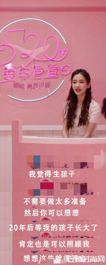 Angelababy和现场多对情侣、夫妻互动,遇到一名担心当妈妈的已婚女性,被问到怀小海绵是什么心情时,答道:我觉得生孩子不需要做太多准备,然后你可以想想,20年后等我的孩子长大了,肯定也是可以照顾我,想想这些就狠开心。她认为女孩不用想太多,找到了对的人,就可以赶紧要个孩子,趁年轻赶紧要个孩子。