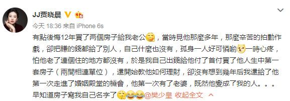 贾晓晨似乎有感而发,突在微博发文指出,过去因心疼老公把赚到的钱都给了别人,孤身一人却没有任何房产,担心对方年老后没有依靠,因此买了2栋房子送给对方,不仅帮忙付了头期款,还教会了樊少皇理财,却没想到几年后,我还给了他第一次走进了婚姻殿堂的机会,他第一次有了老婆,既然他变成了我的人…早知道房子写我自己(的)名字了。