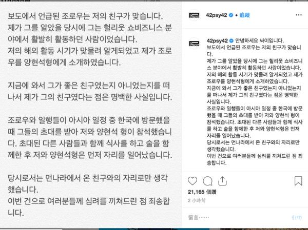 PSY强调:当时以为只是和远道而来的朋友见个面,很抱歉,因为这次的事让大家操心了。而这篇发文,也确认报导中所指的世界级韩星就是他没错。