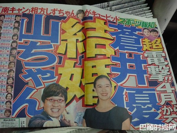5日凌晨推特有网友传出一张翻摄报纸头版的照片,标题写道闪婚!四月开始交往 苍井优跟山ちゃん结婚,照片迅速在推特流传开了,在深夜震惊日本网友。随后更流传出全版报导,内容写道,两人从4月开始交往,1个多月后就闪电结婚,牵起爱的桥梁的邱比特就是曾与苍井优合作电影《扶桑花女孩》的南海甜心的另一名成员山崎静代。