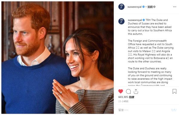 英国皇室透过哈利王子(Prince Harry)与梅根王妃(Meghan Markle)官方Instagram帐号宣布,两人在这个秋季将一同前往南非旅行,此趟旅程除了会到马拉威和安哥拉,哈利王子也会顺路到波札那进行短暂工作探访。但最令人期待的是,此次旅行将带上刚于5月份刚出生的小王子亚契(Archie Harrison Mountbatten-Windsor), 发文最后也兴奋写道:这将会是他们第一次的家庭旅行!