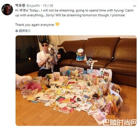 朴有天的弟弟朴有焕3日在Twitter公开了哥哥的照片,并写下嗨,小傻瓜们,今天我不会直播,因为想花时间与我的哥哥一起,聊一下近况,而在照片中,可以看到朴有天抱着他的爱犬坐在地上,而围绕在他周围的都是粉丝送的卡片,经历过吸毒案之后,还是有大批死忠粉丝支持。