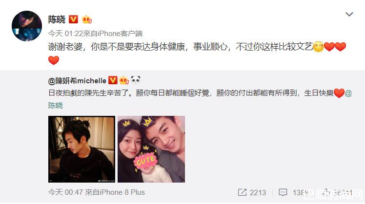 而陈晓也随即回覆老婆,谢谢老婆,妳是不是要表达身体健康,事业顺心,不過妳这样比较文艺。语末附上一个调皮的表情符号及3颗爱心和老婆相呼应。其实仔细翻看两人微博,上次互动已经是2个月前陈妍希生日,如今借着生日打破了前段时间的婚变传闻,也证明一家三口好着呢!