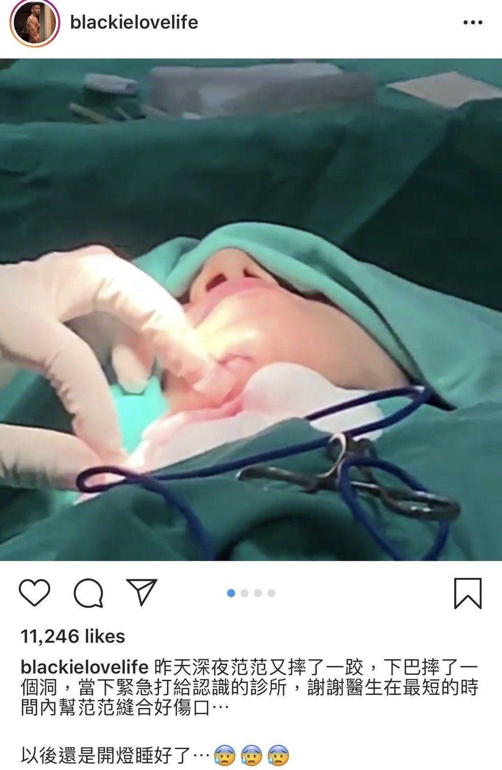 范范的伤势照,点开前还被脸书注明这张照片可能含有血腥暴力内容,就可知道伤口让人看了多么怵目惊心,紧急送医后共缝了15针。黑人稍早也在ig分享范范就医时的影片,包括伤口缝合的影片,并写道:昨天深夜范范又摔了一跤,下巴摔了一个洞,当下紧急打给认识的诊所,谢谢医生在最短的时间内帮范范缝合好伤口,文末还写道以后还是开灯睡好了,看来也受了不少惊吓,而范范今天将如期出席的时尚活动。