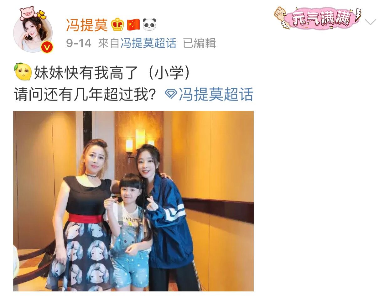 除了放送粉丝福利外,自己也逗趣的说妹妹快比我高了,请问还有几年超过我?,外传冯提莫的身高只有150,从照片上来看冯提莫的妹妹身高落在她的肩膀,要超过她的身高可是指日可待。让网友纷纷说道两年之内,提莫会知道什么叫做残忍、没事还有三年时间让你领先,到时候合照还不知道谁向妹妹呢、一家人都是美人胚子、 两年技能超过老板喔、小孩子长很快的妹妹从小就这么可爱。