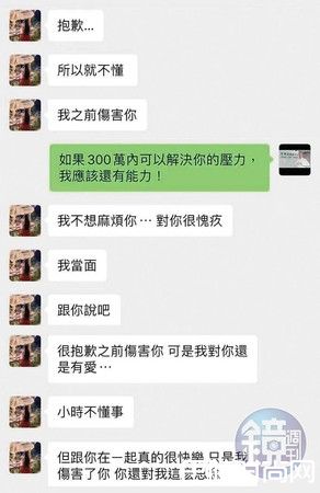 李光辉提供与翁子涵交往时的对话纪录,可见2人当时的办公室恋情的确爱的低调。即便分手后,翁子涵似乎还忘不了李光辉对她的好,言谈间甚至还对李表示对你还是有爱,更向李光辉抱怨外界对她的误解。