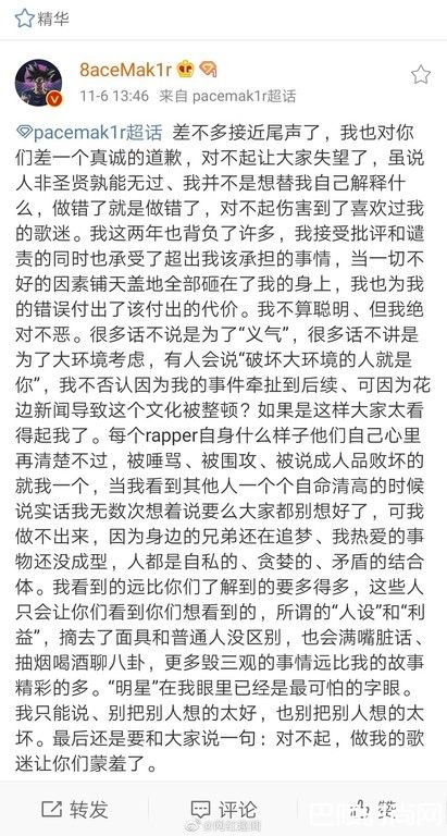PG ONE在回覆网友留言时也解释,自己并没有逃避做错的事,也接受大家的谴责和批评,毕竟自己是公众人物,我应当承受来自网路的抨击,但同行不配,特别是自身就黑到骨子里的人。他也批评,其实圈内大家保护自己不是坏事,但别tm在别人身处险境的时候还扔刀子,对于落井下石的同行表达了强烈不满。