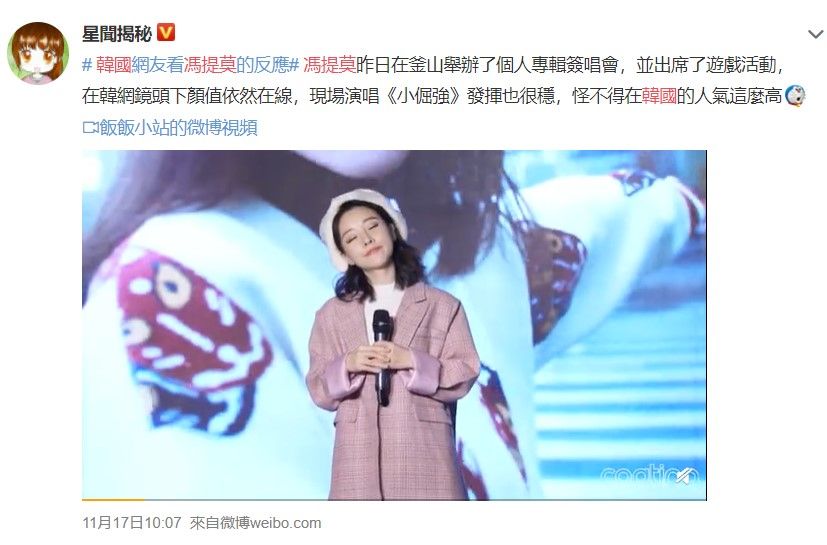 人气直播主冯提莫,以亮丽的外型和清甜的歌声,同时拥有脍炙人口歌曲《佛系少女》、《哼》、《元气满满》等,在大陆斗鱼直播平台获得了超高人气,更被网友称为华人第一网红。日前冯提莫与斗鱼直播平台的5年合约即将期满,将会在平台上停播。近日冯提莫前往韩国釜山举办专辑签售会,在韩国当地高人气的情况在微博上转发,立刻引起了网友们热议。