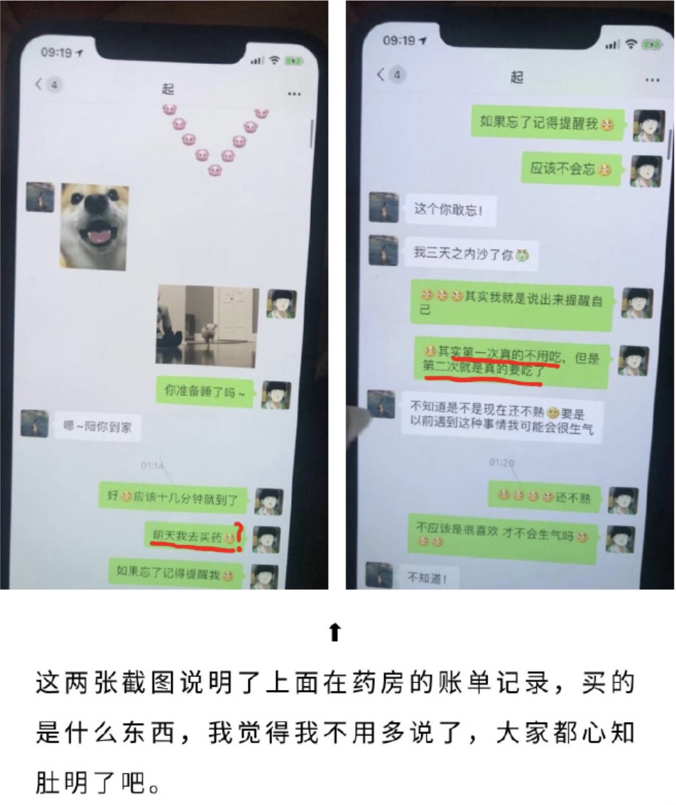 然而在阿沁曝光的对话纪录里该位女子的昵称为起,在11月16号时刘阳也将手机解锁的照片换成那位女生的照片,在对话纪录中更说道:其实第一次真的不用吃,但是第二次就真的要吃了、我明天去买药,同时也出现了男方转帐给药局的纪录,阿沁也断言两人一定是做了逾矩的行为。对此网友透过昵称和萤幕照片比对出该位小三也是一名知名网红半藏森林本名胡文婕,粉丝们多通常都昵称她为小起,她在微博上123万粉丝追踪,是一名小有名气的网红。