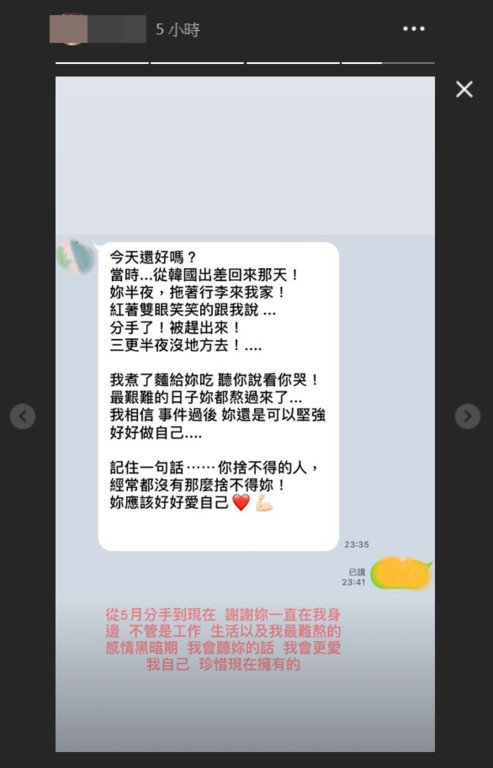 友人回想起当天并鼓励Jessie:最艰难的日子妳都熬过来了…我相信事件过后,妳还是可以坚强,好好做自己…记住一句话…妳舍不得的人,经常都没有那么舍不得妳!妳应该好好爱自己。Jessie也在这个对话纪录截图上表达谢意:从5月分手到现在,谢谢妳一直在我身边,不管是工作、生活以及我最难熬的感情黑暗期,我会听妳的话,我会更爱我自己,珍惜现在拥有的。