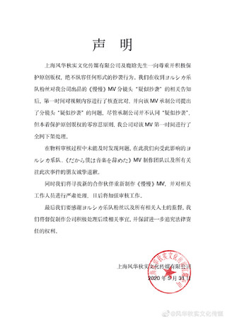 同时声明中公司向受到影响的乐团YORUSHIKA,及相关人员道歉,并且承诺会寻找新的合作对象制作《慢慢》的MV,以及更加强审核,对MV制作公司保留进一步法律追究责任的权利 ,该则微博马上被鹿晗工作室转发。