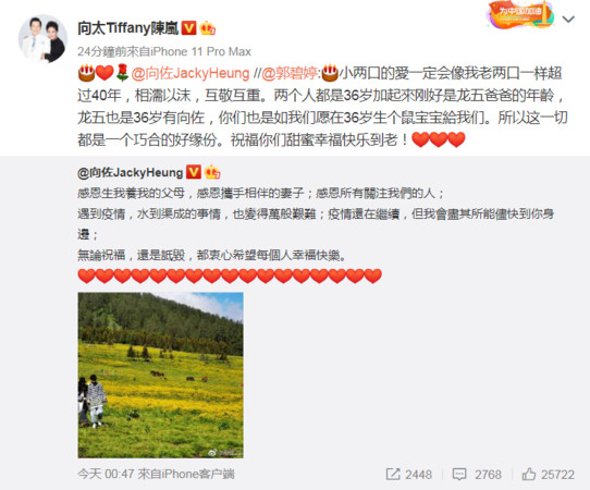 另外在这个特别日子,向太也转发了贴文宣布媳妇怀孕的好消息:两个人都是36岁加起来刚好是龙五爸爸的年龄,龙五也是36岁有向佐,你们也是如我们愿在36岁生个鼠宝宝给我们。所以这一切都是一个巧合的好缘份。祝福你们甜蜜幸福快乐到老!