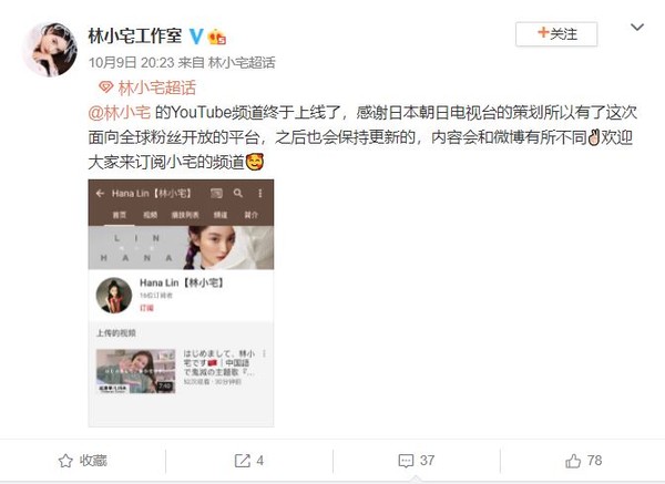 林小宅工作室在微博宣布开设YouTube频道Hana Lin【林小宅】,并感谢由日本朝日电视台策划,疑似即将进军日本,她先在影片开头介绍自己,并表示之前每年都会去日本玩好几次,喜欢在当地购物,可惜今年因疫情关系没办法去,开通频道是也希望与日本粉丝互动。