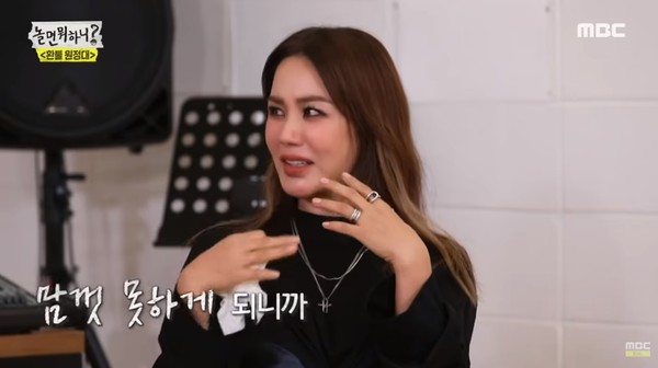 严正化在10日播出的《玩什么好呢》节目中,在刘在锡的帮助下,接受了知名专业歌唱老师卢永主(音译,노영주)的训练,卢一登场便询问她听说接受了手术,想了解一下声带状态,严正花坦言:甲状腺癌手术后,左边声带的神经麻痹了,声带是开着的状态,声音变得出不来。