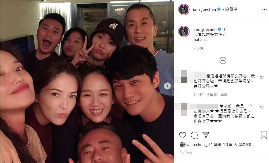 陈乔恩17日在Instagram发文,贴出了几张和好友聚会的合照,只见左脸贴着男友Alan笑得相当幸福,右边则是站着好友许玮宁,一旁还有舒淇、Roger老师等,大方带着男友与闺蜜们相见欢,开心的她忍不住写下我看起来好慈祥喔,可爱的自嘲举动融化了许多粉丝,直呼不是慈祥,是幸福啦,而好友舒淇也回应了她的贴文,留下好几个笑哭的表情符号。