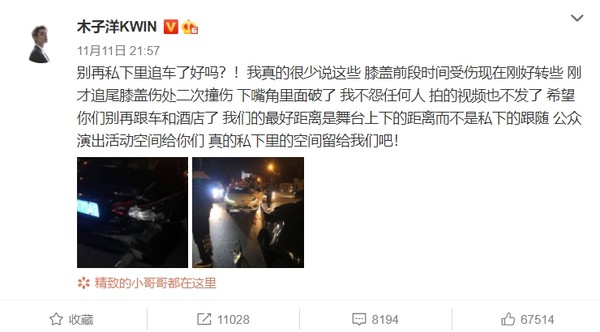 从木子洋发出的事故照片中,可以看到车子尾部已经被撞凹,地上还散落着车祸后的残骸,可见撞击力道之大。他透露伤势:膝盖前段时间受伤,现在刚好转些,刚才追尾,膝盖伤处二次撞伤,下嘴角里面破了。他原本有拍影片为证,但后来决定不发出来,只无奈呼吁:你们别再跟车和酒店了,我们的最好距离是舞台上下的距离而不是私下的跟随,公众演出活动空间给你们,真的私下里的空间留给我们吧!