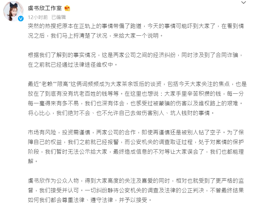 虞书欣妈妈被爆遭到限制消费的消息传出后瞬间引发网友哗然,登上热搜第一,不过虞书欣工作室随即发文澄清是虞书欣妈妈的公司涉及内外勾结的诈骗行为,她的妈妈被牵连属于间接受害人,并不是欠钱不还的加害者,目前已经进入法律程序。又过了七个小时后,虞书欣工作室再度发文强调:这是两家公司之间的经济纠纷,同时涉及到合同诈骗,在之前就已经通过法律途径维权中。