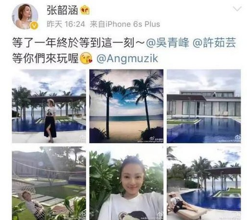 对此,张韶涵认为其实只是觉得女人都要有个Back up才行,自己并没有什么生意头脑。事实上,她2016年在微博PO出一张在海岛渡假的文章,写着:等了一年终于等到这一刻。还标注吴青峰、许茹芸等好友,许茹芸则表示恭喜,更有粉丝惊讶爆料:2年前知道这消息时还挺惊讶的,2年后这个岛终于建好了!而小岛上她盖了一幢别墅,除了游泳池,还有吊床及躺椅可以边喝饮料边看日落,装潢相当奢华享受。