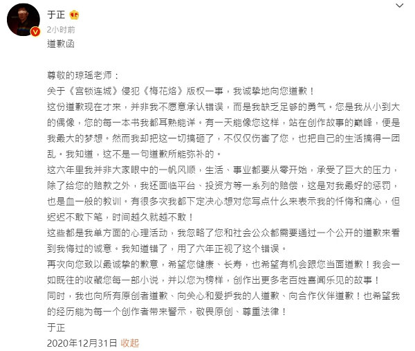 没想到过了几个小时,于正也发文承认《宫锁连城》抄袭《梅花烙》一事并公开向琼瑶道歉,表示多年来并非不愿意承认错误,而是缺乏足够的勇气。他透露琼瑶是他从小到大的偶像,抄袭风波爆发后六年,他承受了巨大的压力,除了给对方的赔款之外,也受到了投资方和平台方面的赔偿惩罚,并解释自己久久不道歉的原因,有很多次我都下定决心想对您写点什么来表示我的忏悔和痛心,但迟迟不敢下笔,时间越久就越不敢!我知道错了,用了六年正视了这个错误。