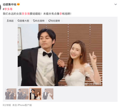 大陆微博18日疯传一则李多海与男星崔成俊(音译:최성준)披婚纱的影片,且内容指出李多海在影片附注婚期将至,影片中,她亲昵地靠在男方身旁,双手比着YA的姿势,手舞足蹈地换上婚纱,脸上露出大大笑容,气氛相当愉快;然而,站在她身旁的并不是男友SE7EN,而是与男星李栋旭长得几分相似的演员崔成俊,瞬间引来大批网友讨论身旁的男生是谁、怎么不是SE7EN、真的要结婚了吗、恭喜姐姐。