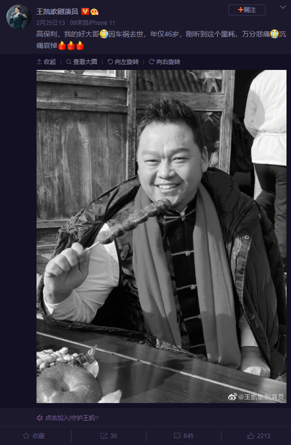 歌剧演员高保利24日午间发生车祸,抢救无效离世,享年44岁。好友龚琳娜和王凯25日得知消息后痛心发文,消息曝光后让大陆网友都非常震惊。