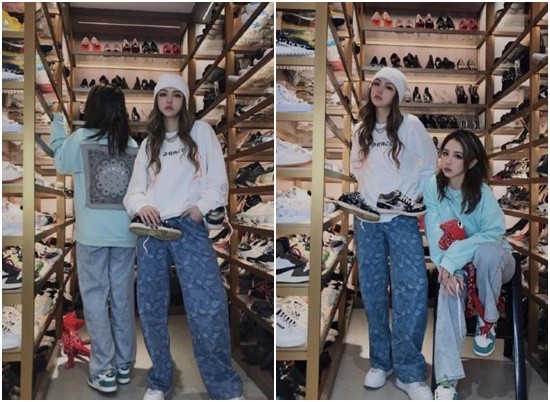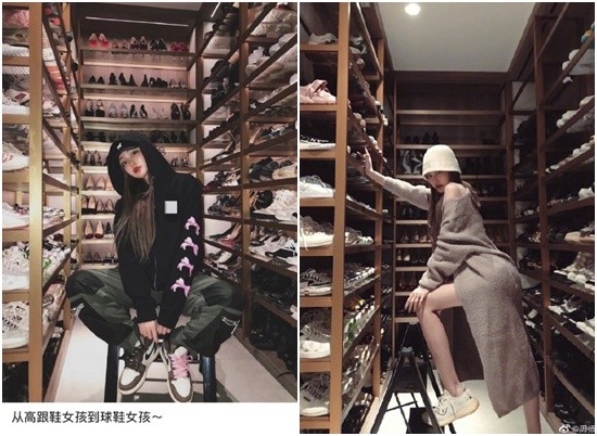 周扬青10日在微博发文,分享和闺蜜的互动,背景就是在自家的鞋柜收藏间,只见她身后的3大面墙特地订做成像是百货公司的商品柜,每一面墙有9层,上面摆了满满的名牌鞋,其中除了高跟鞋,更多的是各大名厂牌的运动休闲鞋,且不乏梦幻鞋款,让人瞠目结舌。