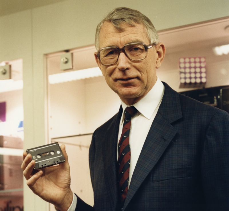 1988年刚退休的Lou Ottens手持他发明的卡式录音带。他在卡式录音带问世25 年后拍摄这张照片,此时已经是卡带时代的终点。