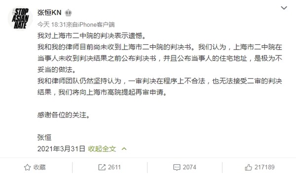 张恒晚间发文,我对上海市二中院的判决表示遗憾,并表示和律师均尚未收到判决书,我和律师团队仍然坚持认为,一审判决在程序上不合法,也无法接受二审的判决,结果,我们将向上海市高院提起再审申请。双方将持续缠讼。