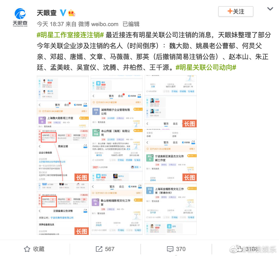 除此之外,根据《财经网》报导,日前多名艺人不约而同注销了工作室,包括魏大勋、姚晨老公曹郁、何炅父亲、邓超、唐嫣、文章、马薇薇、那英(后撤销简易注销公告) 、赵本山、朱正廷、孟美岐、吴宣仪、沉腾、井柏然、王千源,共75位艺人,名下相关企业多达647家,其中已有200家公司被注销,艺人名下关联公司数量最多的是黄晓明,其相关公司一共有43家,其次为章子怡,名下相关公司有29家,为女艺人中公司数量最多。此外,陈坤有25家,李晨有21家,黄磊有20家,何炅有19家,陈赫18家,靳东18家,郑恺17家,黄渤16家,赵薇14家,皆是演艺圈名气极高的大腕艺人,引发哗然。