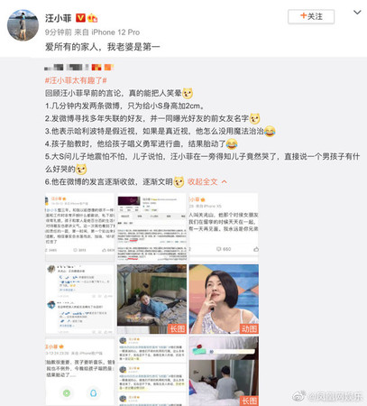 据报导,汪小菲6日深夜转发网友整理他早期的微博言论,并说:爱所有的家人,我老婆是第一。该整理贴文中就提到他曾为了替小S(徐熙娣)身高增加2公分,几分钟内就发了好几次微博,曾在大S怀孕时想做胎教大唱《义勇军进行曲》,结果对方胎动了等大大小小的言论,被大陆网友笑说把微博当好友圈在发。