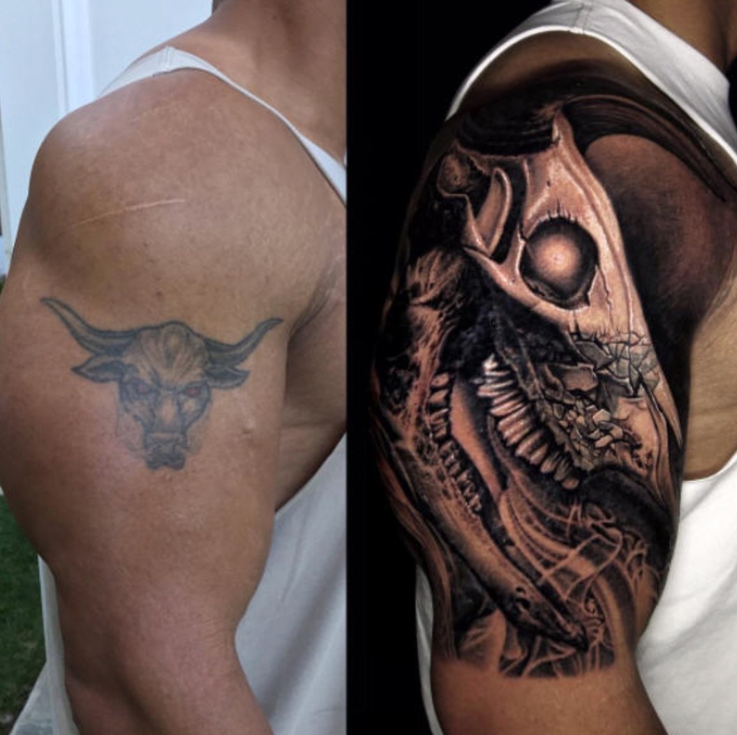 日前巨石强森就在instagram贴出一系列刺青照,找来美国知名师傅Yomico Moreno将原本手臂上的小公牛纹身进行大改造,据悉这个刺青源自于他在WWE的昵称The Brahma Bull ,象征着力量、心灵、反抗,总共花费将近30小时的时间,才将小公牛覆盖,进化成一头巨大猛兽大公牛图案,显得阳刚又霸气!