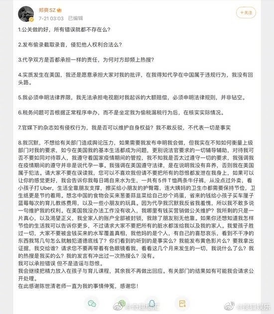 针对争议,郑爽希望大家不要被金钱买来的水军覆盖真相,我他妈的是个人,有自己的喜怒哀乐,看到不干净的东西我骂几句怎么就触犯道德底线了?你们看到的听到的是事实吗?要我拿出证据,我交给谁?请求您不要再带着有色眼镜看我,看看这几个月来发生的一切,我说什么了吗?她表示自己可以承担错误,但不是造谣与怨恨,更强调自己爱孩子胜过一切,我会继续把精力放入在孩子与育儿课程,其余我不再做出回应。